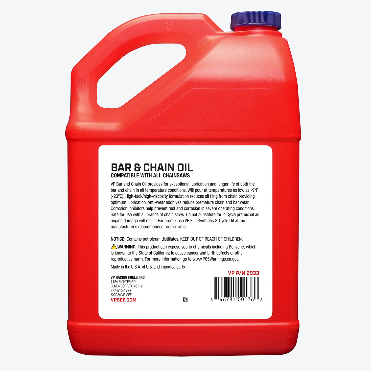 A high-quality bar and chain oil is crucial for chainsaws to maintain maximum performance and reliability. If your chainsaw chain runs slowly or your fuel tank runs dry quicker than it should, chances are high that you need to add bar chain oil - and fast. A slow chain and excessive fuel consumption mean theres too much friction between your bar and chain. That friction produces excess heat, which can do major damage to your saw.Our bar oil delivers precisely what you need. To begin with, we engineer it to provide a thicker, stronger oil film with anti-wear additives. Consequently, you get superior lubrication and protection of metal surfaces. VP bar chain oil contains more tack for less fling-off and better chain protection. It delivers all-season performance and higher viscosity throughout bar operating temperatures. It won't let you down when you need your saw to perform.Additionally, keep your chainsaw running smoothly and reliably every time with VP Small Engine Fuel, which is made specifically for the high demands of hard-working, high-RPM small engines.
